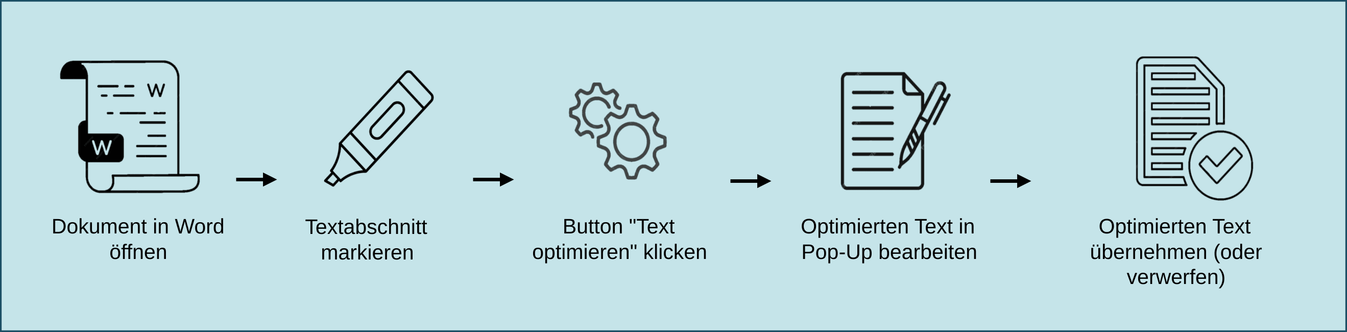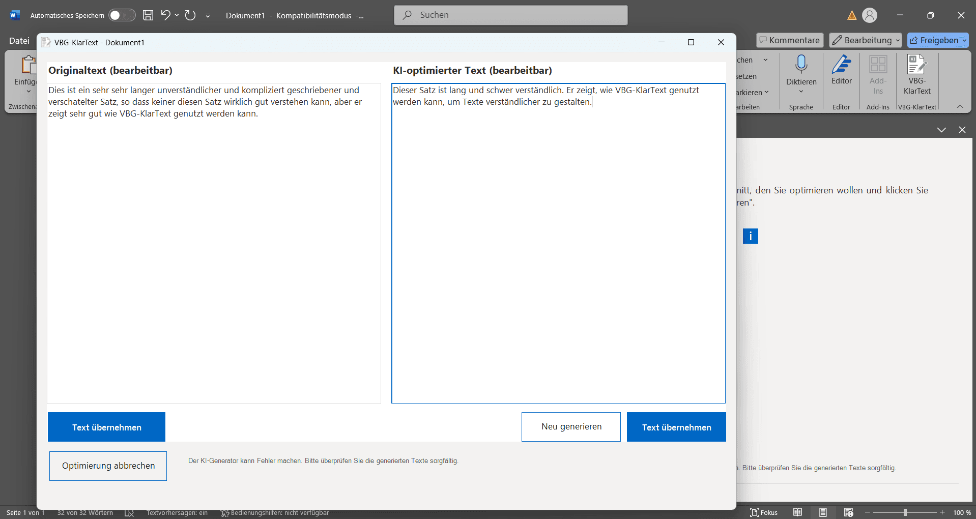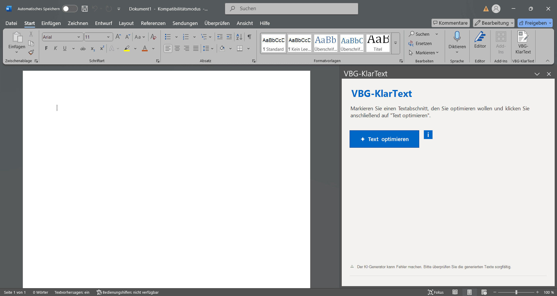 Behörden-KlarText ist direkt in Microsoft Word integriert. Sie können sowohl neue als auch bereits bestehende Dokumente ganz normal in Word öffnen und bearbeiten. Nach dem Öffnen Ihres Dokuments finden Sie das Behörden-KlarText-Symbol in der oberen Menüleiste. Mit einem Klick darauf öffnen Sie das Add-In. Von dort aus lassen sich alle wichtigen Funktionen bequem steuern. Um einen Text zu verbessern, markieren Sie einfach den gewünschten Textabschnitt in Ihrem Dokument und klicken anschließend auf den blauen Button "Text optimieren". Sie können den Vorschlag ins Dokument übernehmen, neu generieren oder weiter bearbeiten.