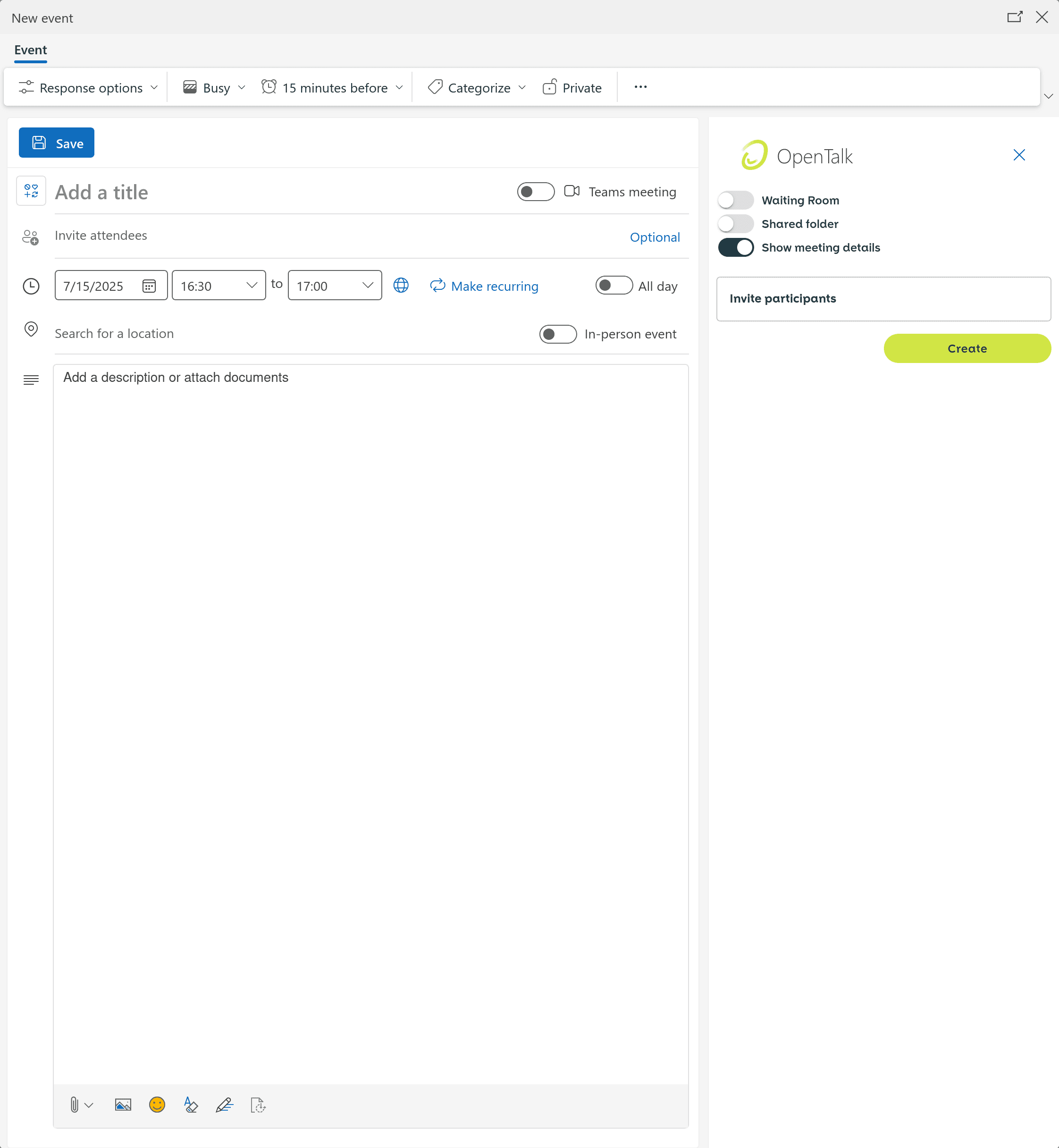 Das Add-In ermöglicht das direkte Erstellen, Bearbeiten und Löschen von OpenTalk-Videokonferenzen im Outlook-Kalender. Automatisch generierte Teilnahmelinks werden sowohl im Beschreibungstext als auch im Standortfeld eingefügt, sodass der Zugang zur Videokonferenz direkt aus der Kalenderübersicht möglich ist.