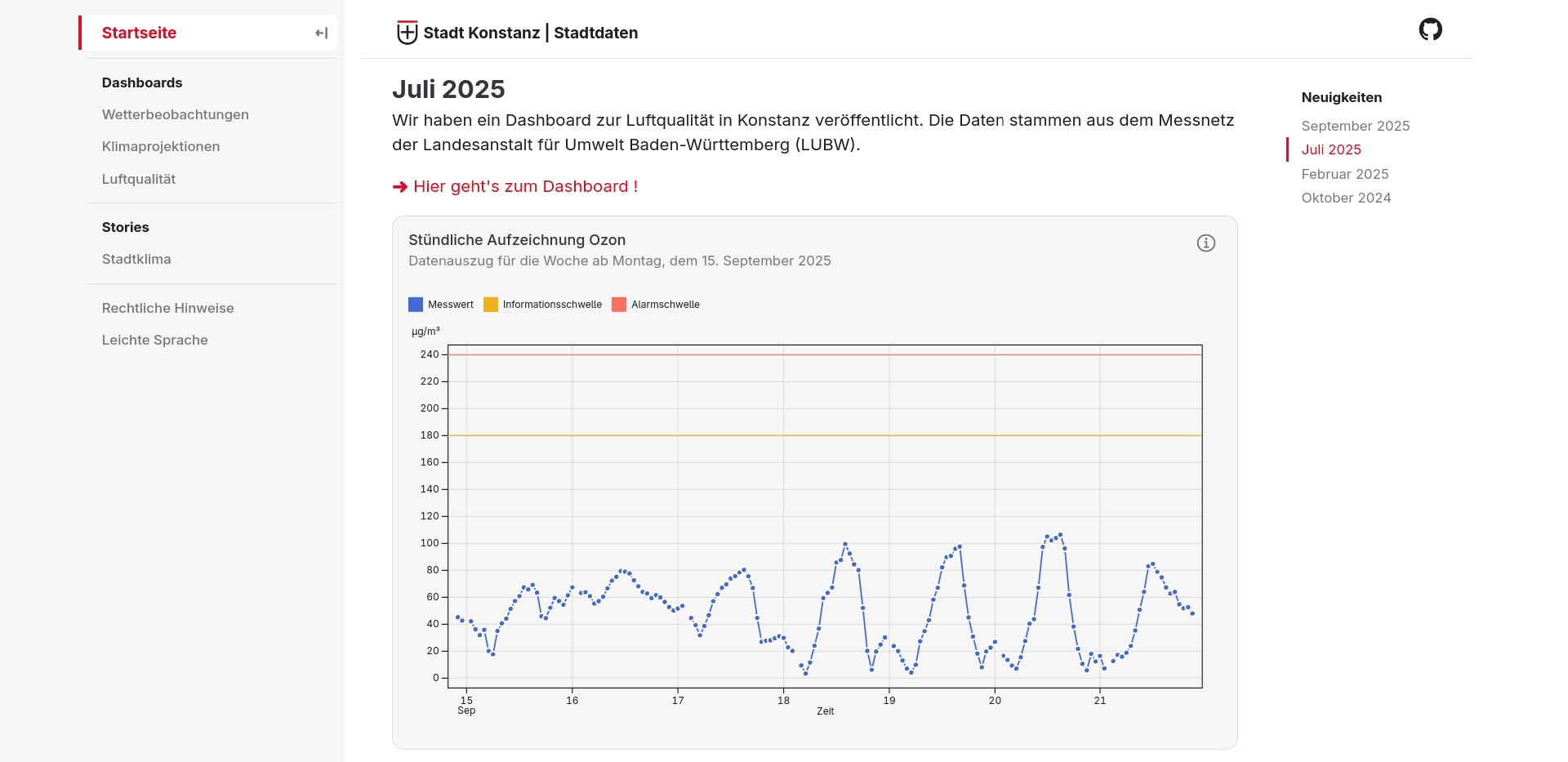 Die „Stadtdaten-Dashboards Konstanz“ sind eine öffentliche, statische Website für Bürgerinnen und Bürger. Sie bieten datenbasierte Einblicke zu Luftqualität, Wetter und Klimaindikatoren und werden automatisch wöchentlich aktualisiert. Die Dashboards sind datensparsam umgesetzt, verzichten auf Tracking und Cookies und sind für mobile Endgeräte optimiert. Maßnahmen zur Barrierefreiheit umfassen responsives Design, leichte Sprache und Screen-Reader-Support. Die Website ist produktiv erreichbar unter: https://stadtdaten.konstanz.digital